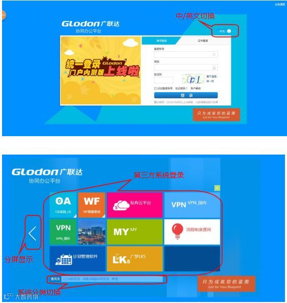 以工作流系统作为门户,实现单点登录,通过系统门户可以方便的访问通用类系统、人力&财务类系统、战略&销售&研发类系统以及其它第三方业务系统,系统支持中/英文双语言切换,满足海外用户使用需求。门户设计采用流行的win8页面样式,在满足用户功能要求的同时提供了更好的视觉感受及用户体验。