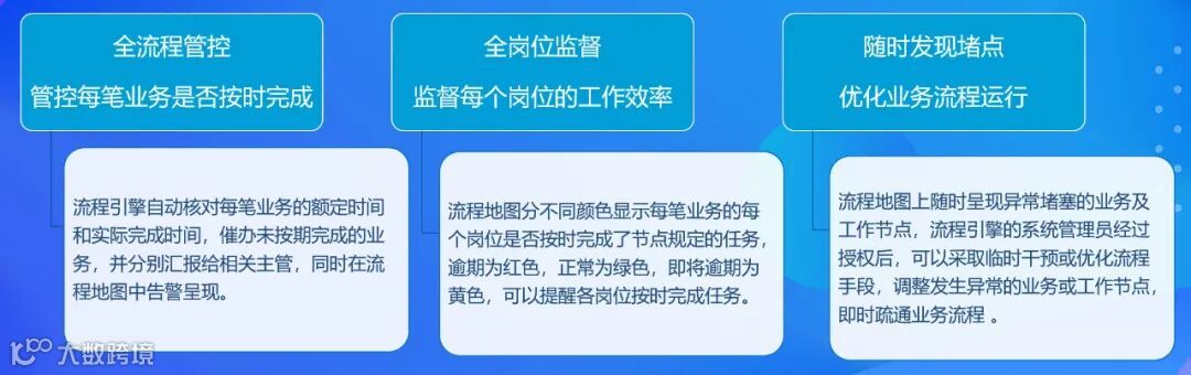 流程引擎自动核对每笔业务的额定时间和实际完成时间,催办未按期完成的业务,并分别汇报给相关主管,同时在流程地图中告警呈现。