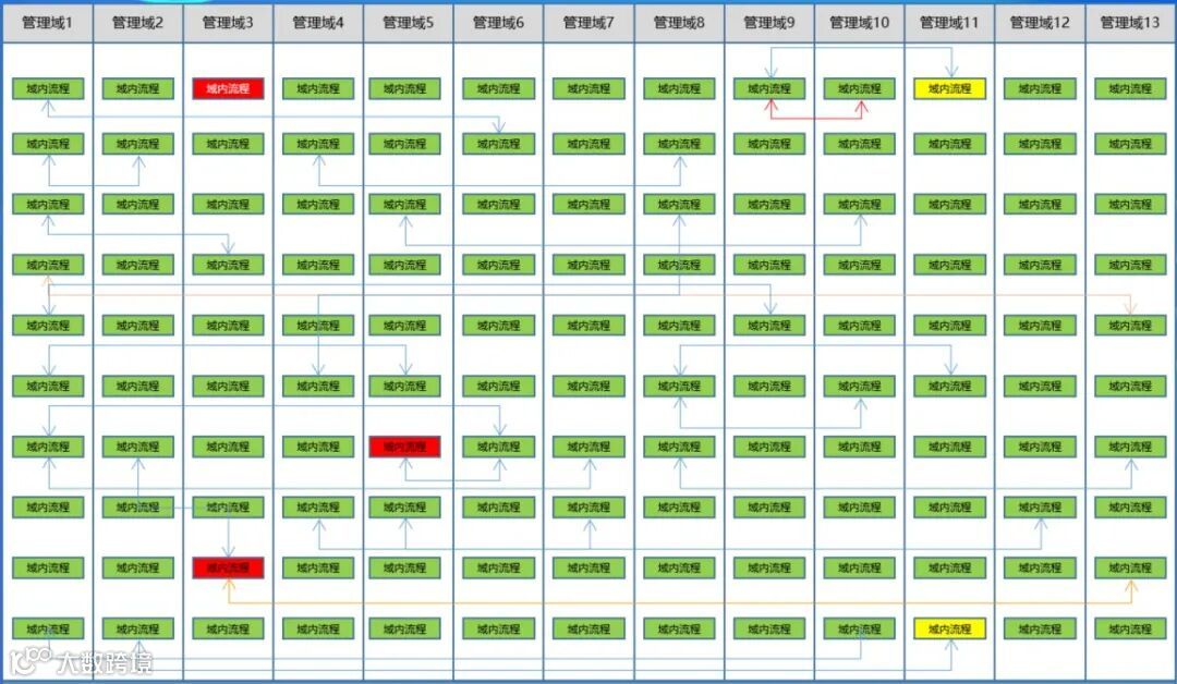 大型企事业单位的管理流程按照管理域分类,每个管理域包括若干业务流程,按照矩阵列表展示流程当前的效能数据;哪些流程业务已经延期(红色),哪些流程业务将要延期(黄色),哪些流程衔接堵塞(红色)。