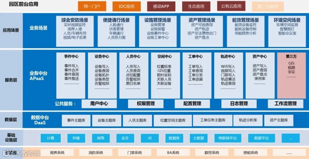 1、基于园区基础网络,通过物联网平台连接园区内各基础层弱电子系统设施;