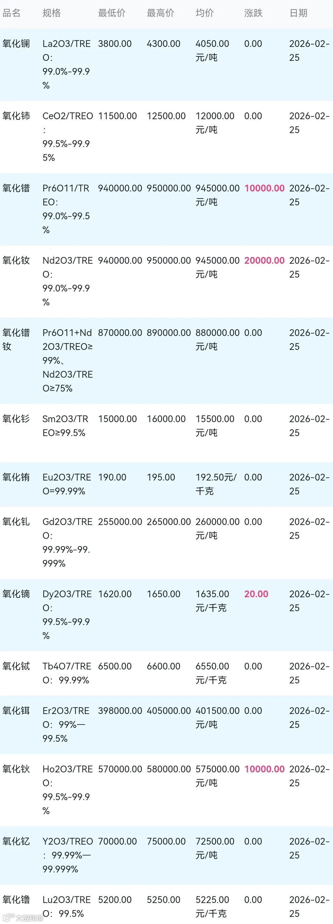 2026年02月25日稀土氧化物材料市场参考价: