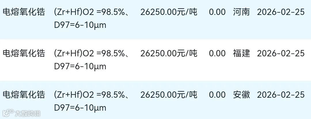 2026年02月25日氧化锆材料市场参考价: