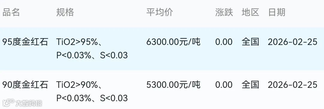 2026年02月25日金红石材料市场参考价: