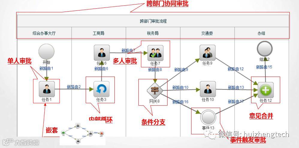 基于慧正工作流搭建业务流程模型,业务流程模型中描述了互联审批的业务流程中串行、并行、条件、触发等的流转状态。