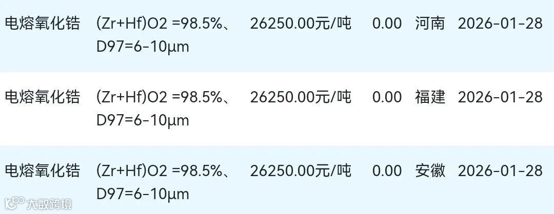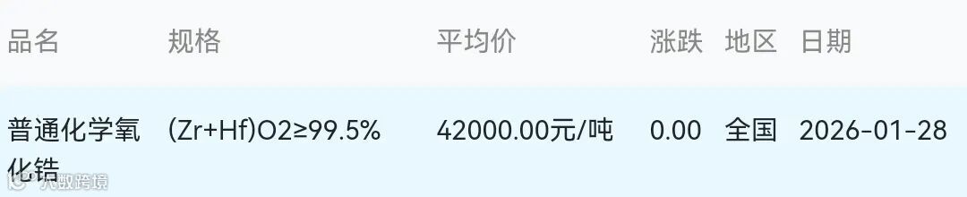2026年01月28日氧化锆材料市场参考价: