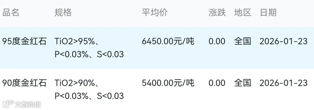 2026年01月23日金红石材料市场参考价:
