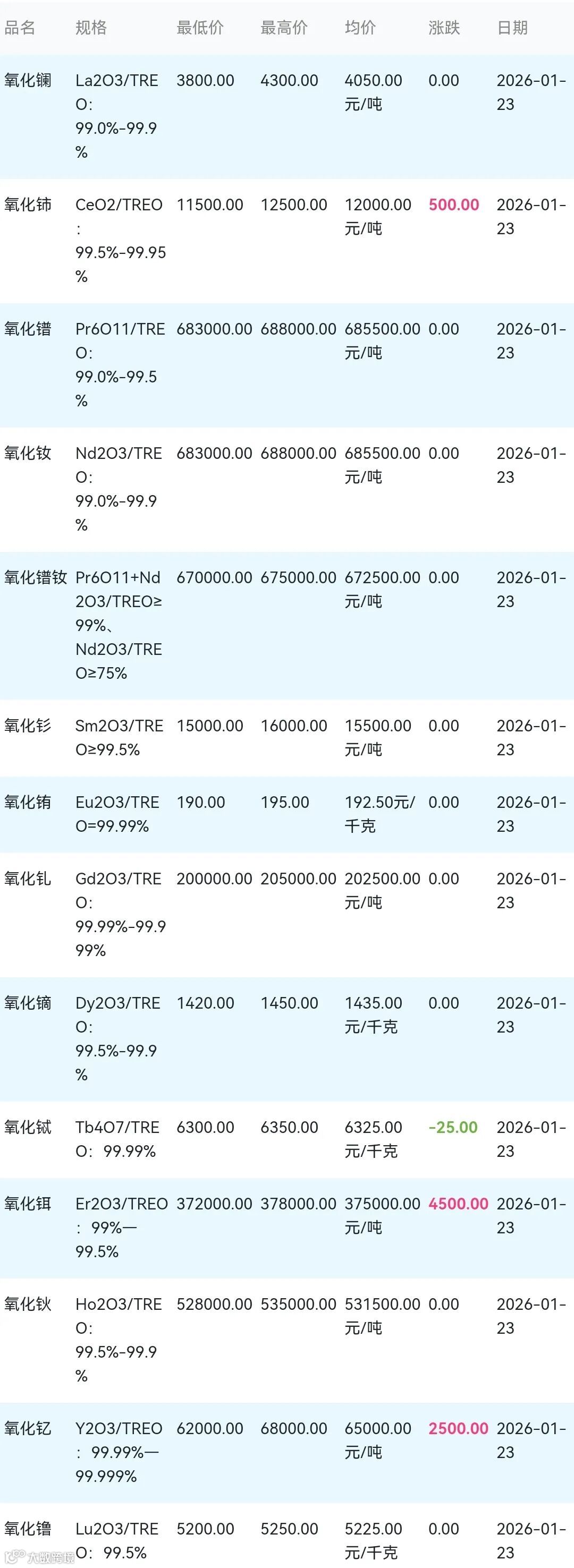 2026年01月23日稀土氧化物材料市场参考价: