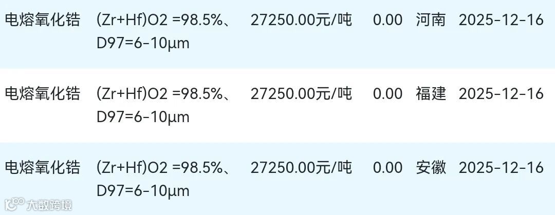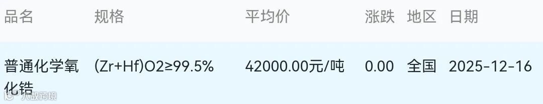 2025年12月16日氧化锆材料市场参考价: