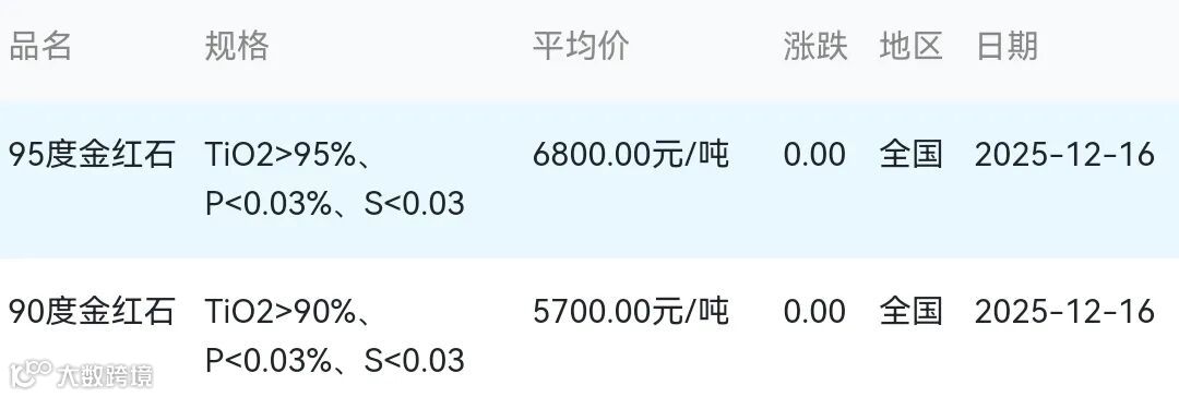 2025年12月16日金红石材料市场参考价:
