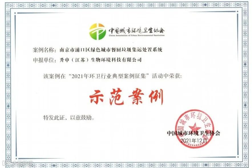 近日,由中国城市环境卫生协会举办的“2021 环卫行业典型案例征集”活动公布评选结果,经过行业内各领域专家严格遴选,升申(江苏)生物环境科技有限公司提报的“南京市浦口区绿色城市餐厨垃圾集运处置系统”脱颖而出,荣获“示范案例”。