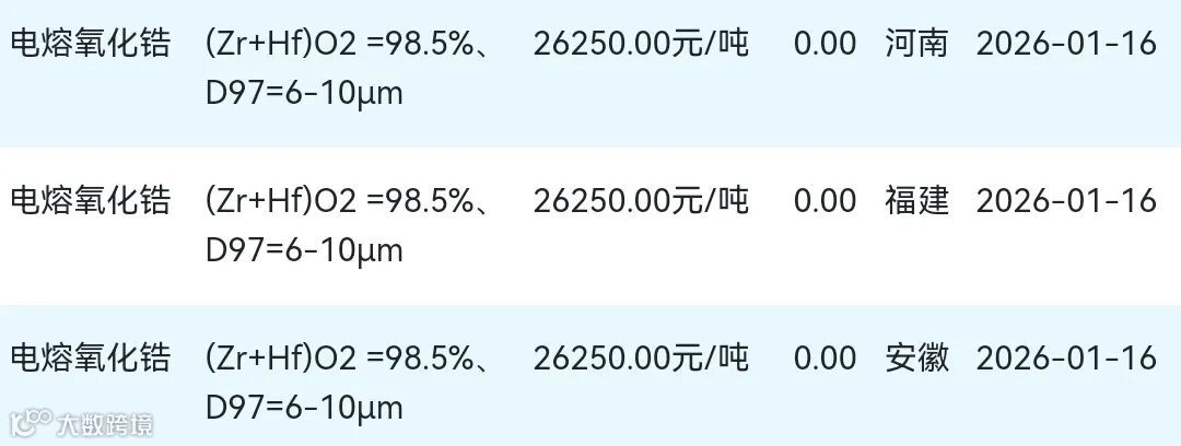 2026年01月16日氧化锆材料市场参考价: