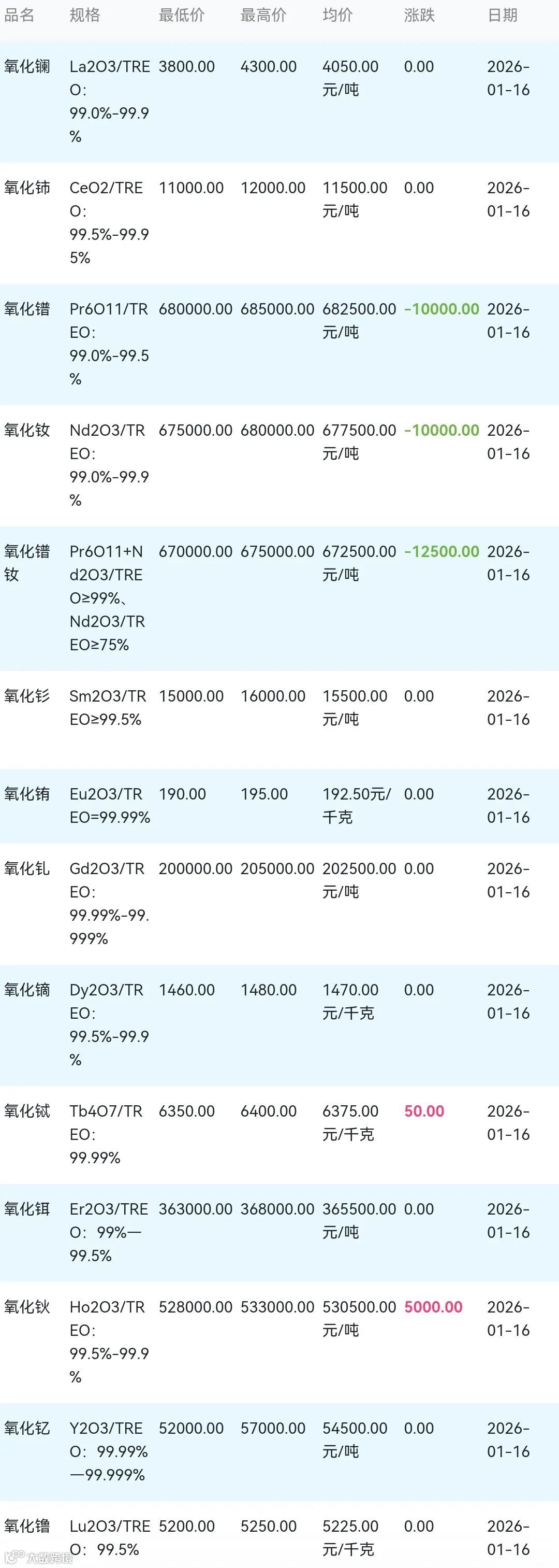 2026年01月16日稀土氧化物材料市场参考价: