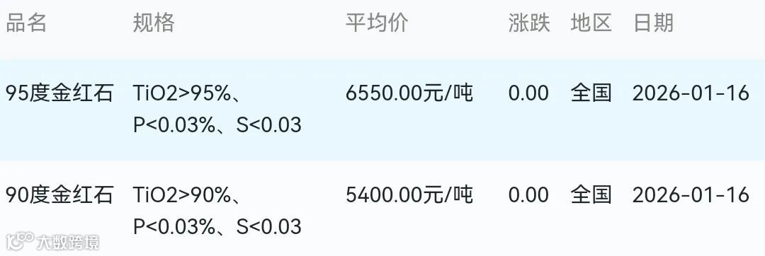 2026年01月16日金红石材料市场参考价: