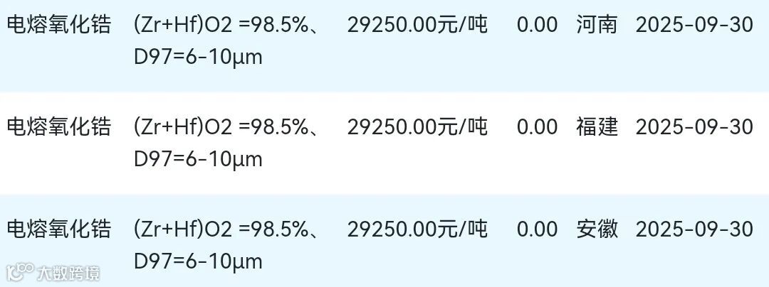 2025年09月30日氧化锆材料市场参考价: