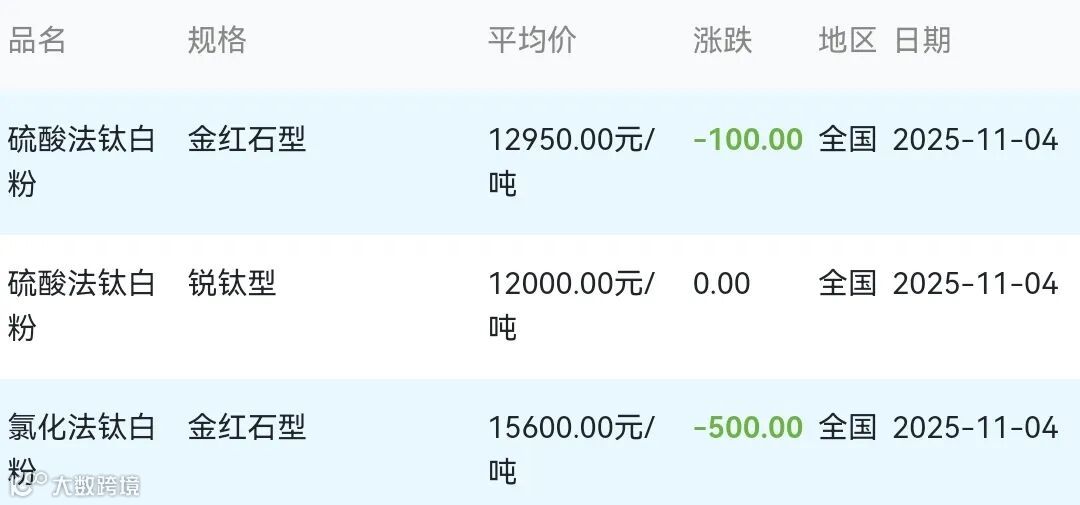 2025年11月04日钛白粉材料市场参考价:
