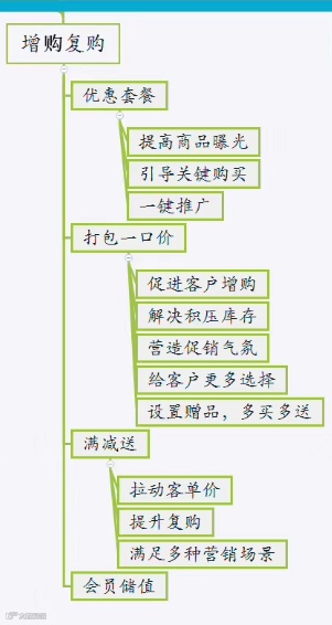 说到增购复购,在销售环节的最终端,一个小设置或者一个小动作,都有可能引起客户的复购甚至增购。打比方在产品的设置上,不同类型的优惠套餐引导客户购买;设置优惠活动上面进行满减送或者满额一口价等等,客户有可能被这些促销吸引从而购买更多产品。