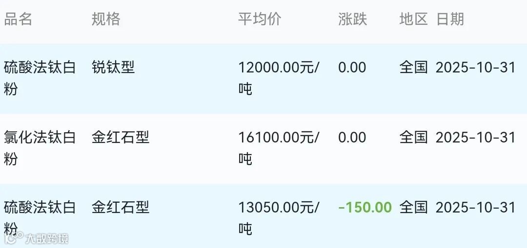 2025年10月31日钛白粉材料市场参考价: