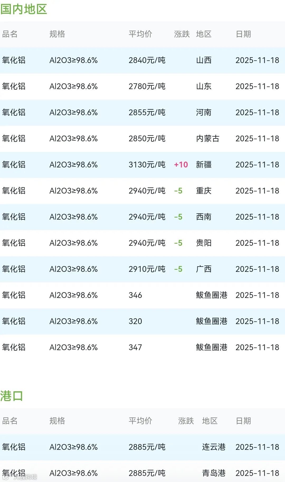 2025年11月18日氧化铝粉体材料市场参考价: