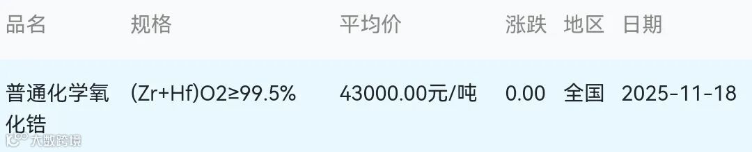 2025年11月18日氧化锆材料市场参考价: