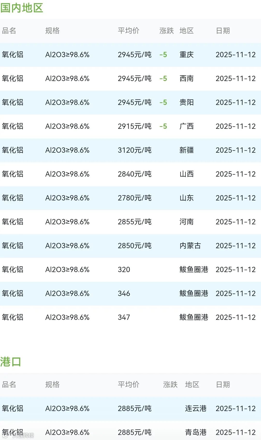 2025年11月12日氧化铝粉体材料市场参考价: