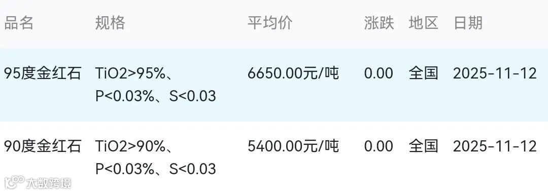 2025年11月12日金红石材料市场参考价: