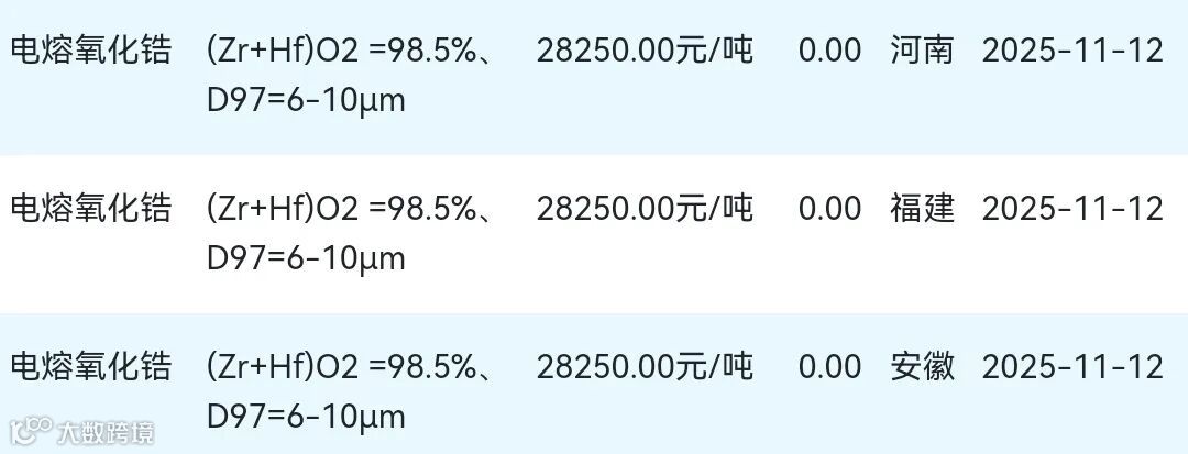 2025年11月12日氧化锆材料市场参考价: