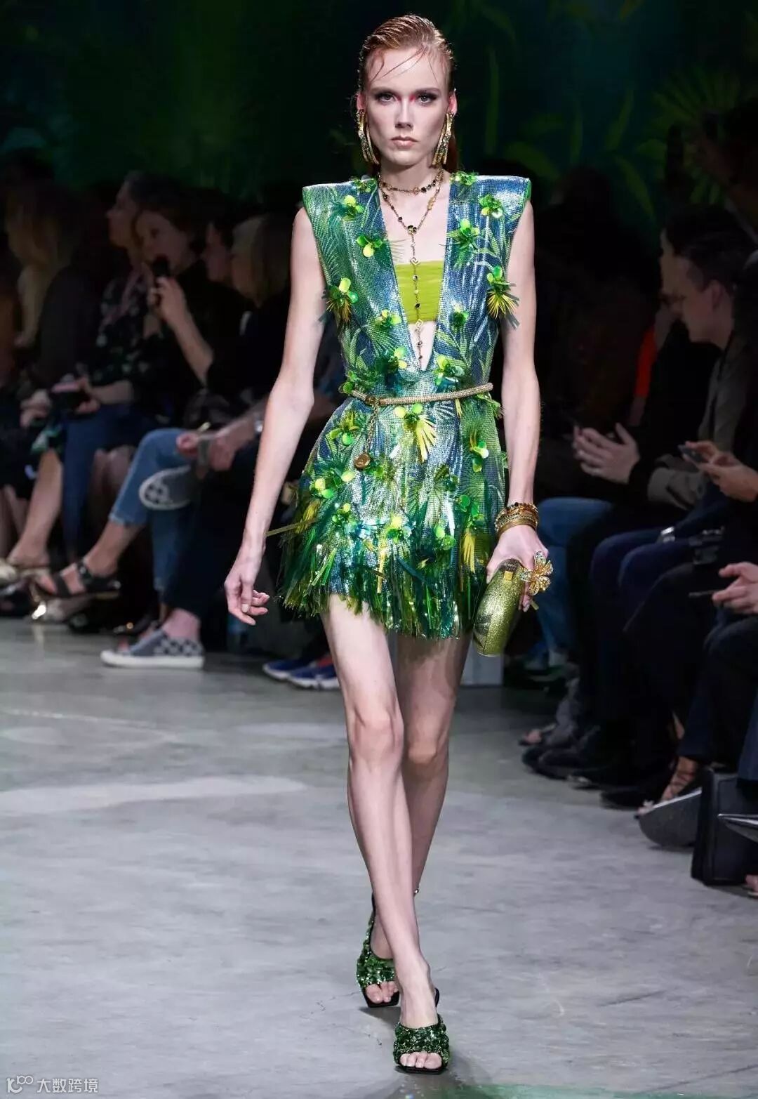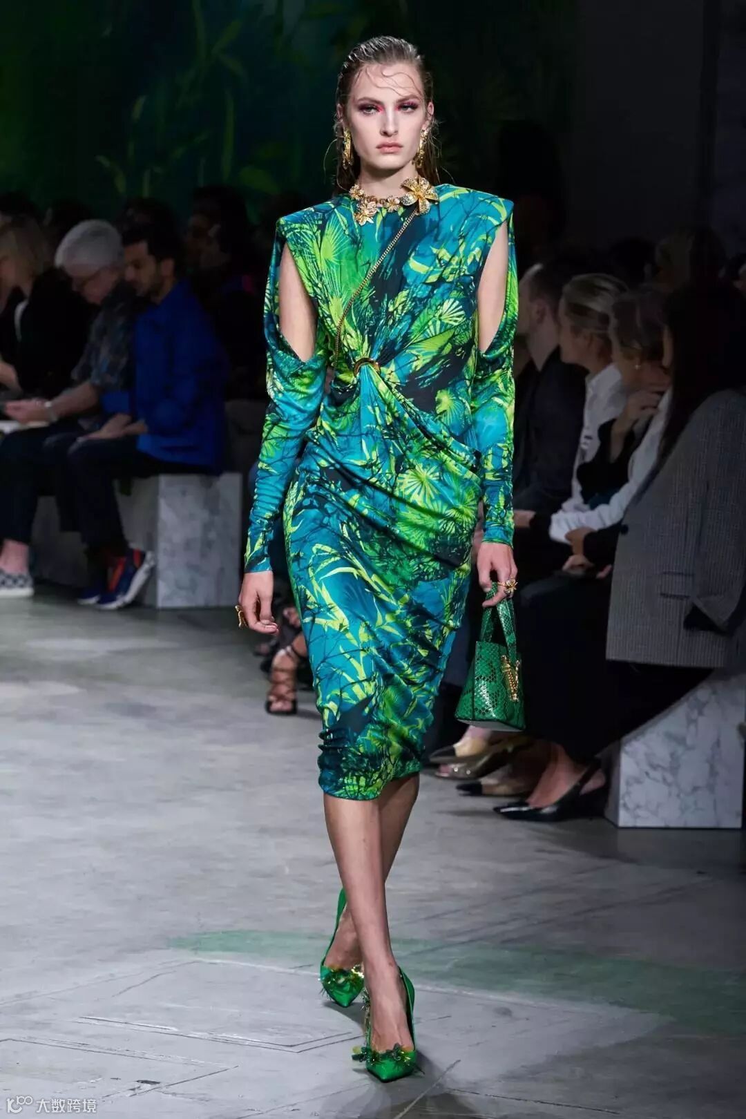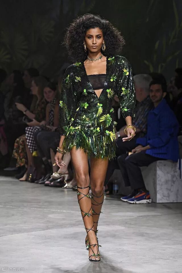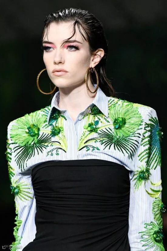 同样把森林系的植入运用到设计上的还有范思哲(Versace)。在2020春夏系列中,范思哲和谷歌合作,将技术、古典主义与时尚融合,用鲜艳色彩和饰有丛林细节的印花元素,为新系列带来了新的技术与革新。