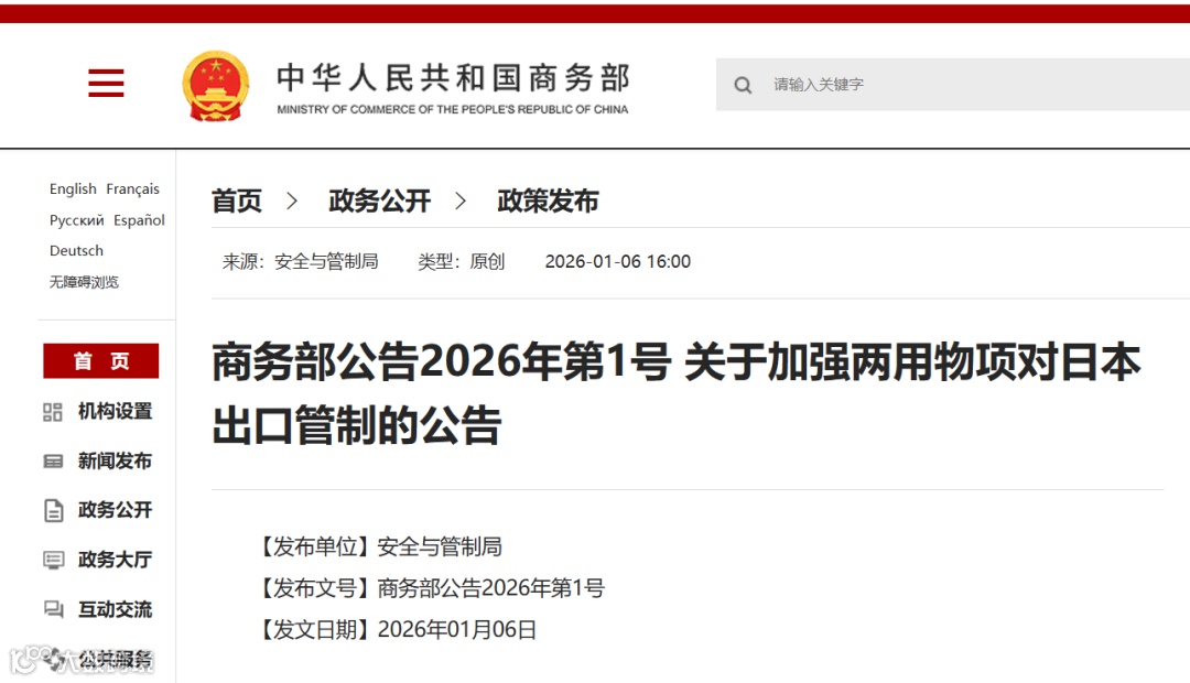 1月6日,商务部公告,根据《中华人民共和国出口管制法》等法律法规有关规定,为维护国家安全和利益、履行防扩散等国际义务,决定加强两用物项对日本出口管制。