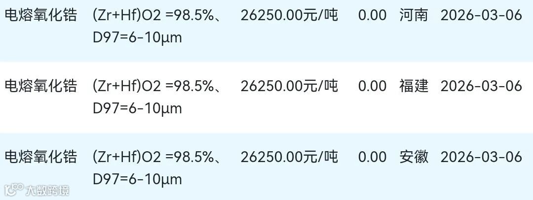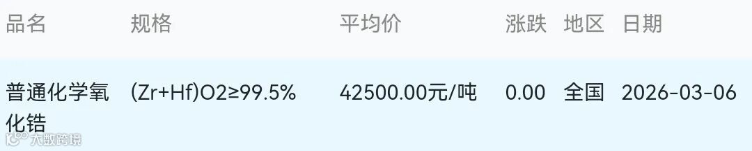 2026年03月06日氧化锆材料市场参考价: