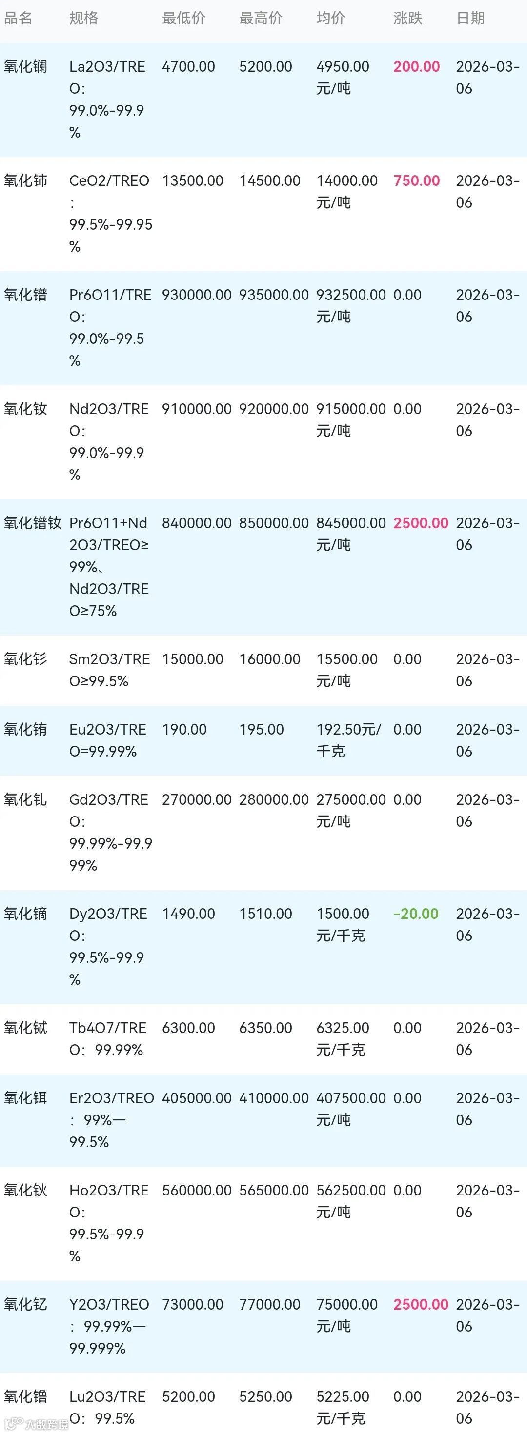 2026年03月06日稀土氧化物材料市场参考价:
