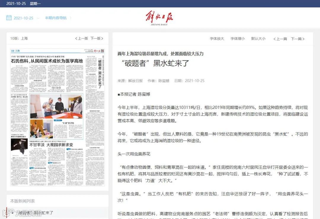 今年,“破题者”出现,但出人意料的是,它竟是一种19世纪在南美洲被发现的昆虫“黑水虻”。不远的将来,它或将成为上海消纳湿垃圾的一种途径。