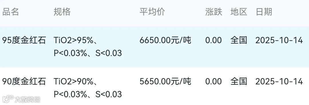 2025年10月14日金红石材料市场参考价: