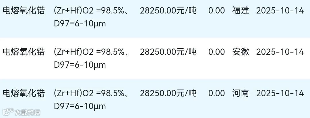 2025年10月14日氧化锆材料市场参考价: