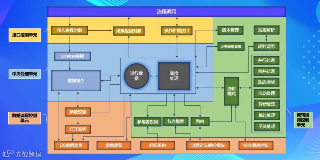 统一流程中心中定义了各管理域的业务流程,各业务系统使用统一流程服务进行业务流转;