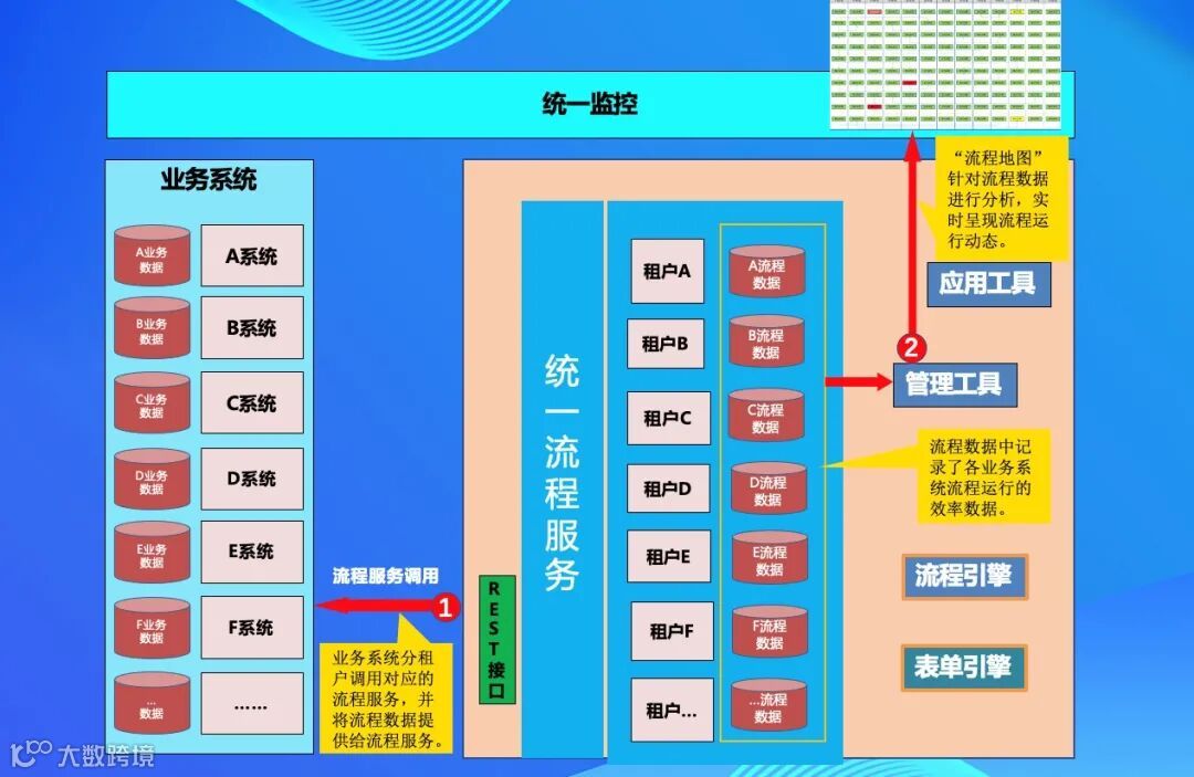 统一监控:管理部门可以对各业务流程运行效率进行监控分析,基于流程运行效率进行绩效管理和优化。