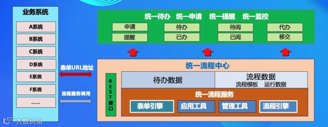 各业务系统将待办表单URL地址推送至统一流程中心,流程中心组织流程数据和待办数据,发待办提醒给用户,用户在“我的待办”中打开表单进行待办事项办理;