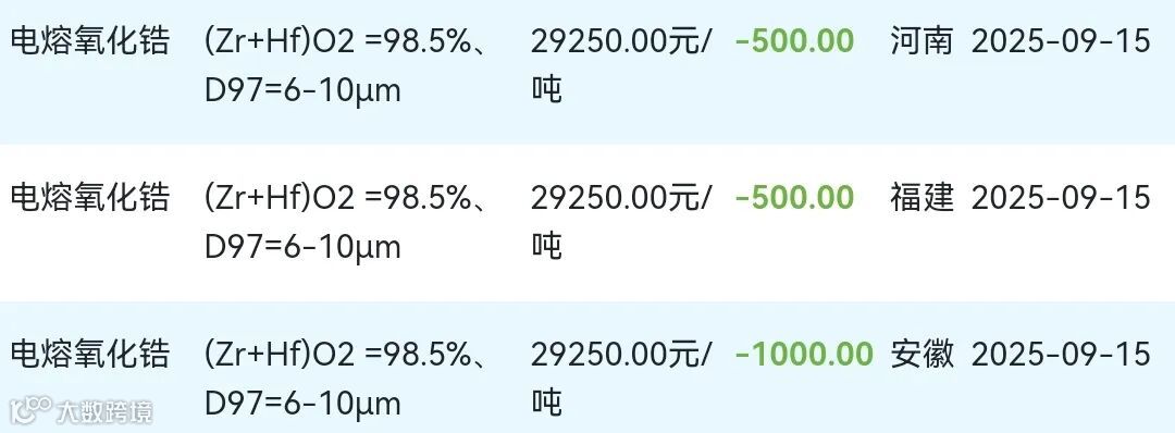 2025年09月15日氧化锆材料市场参考价: