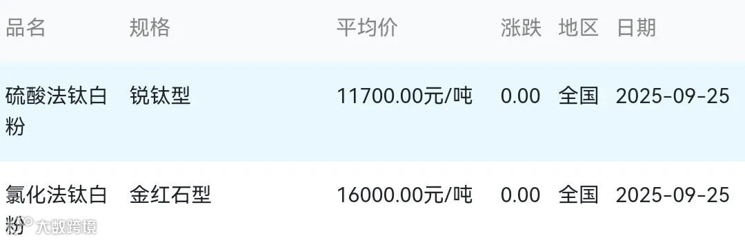 2025年09月25日钛白粉材料市场参考价: