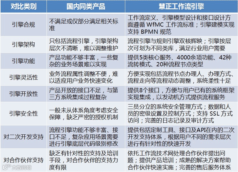 慧正工作流引擎与国内工作流产品对比