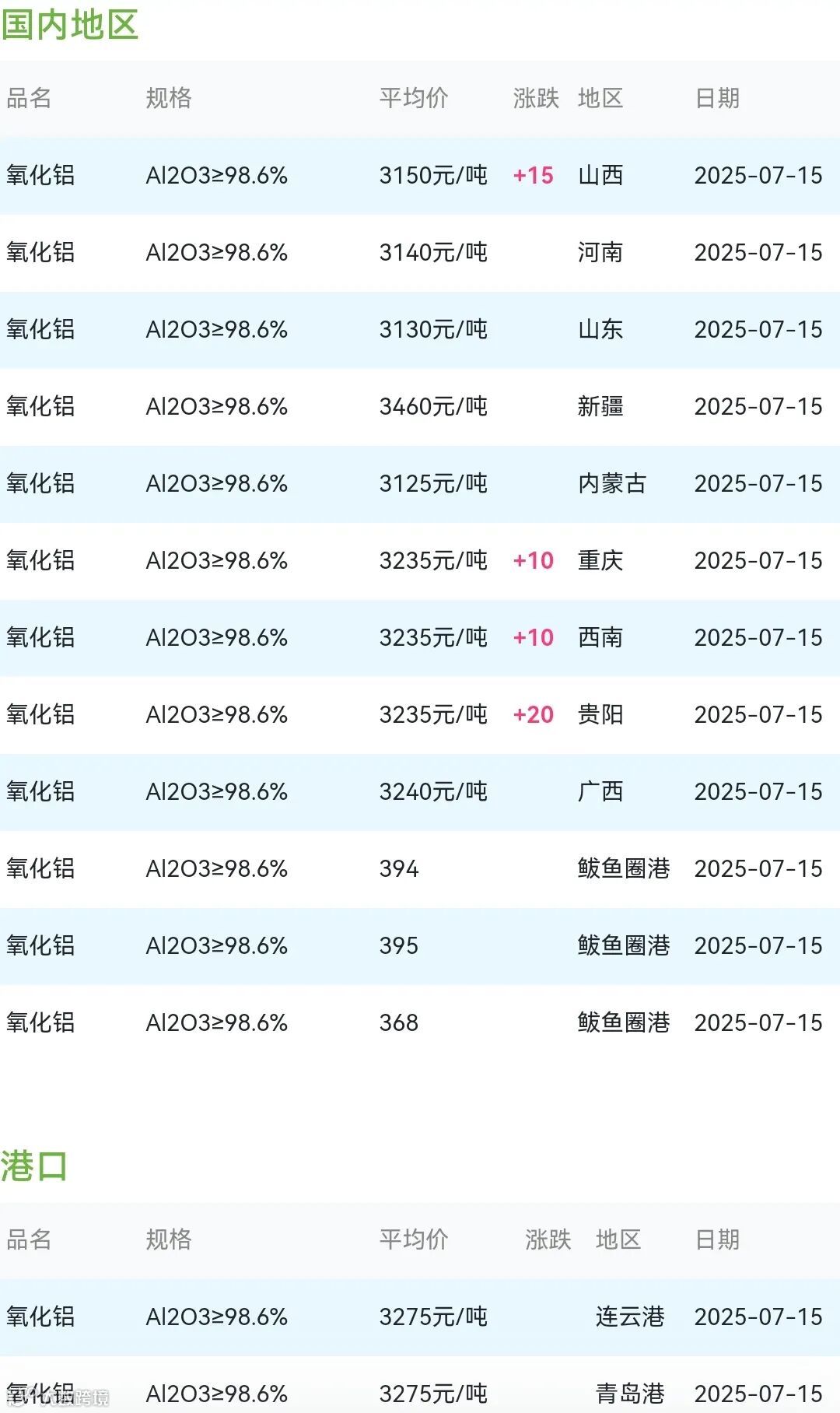 2025年07月15日氧化铝粉体材料市场参考价: