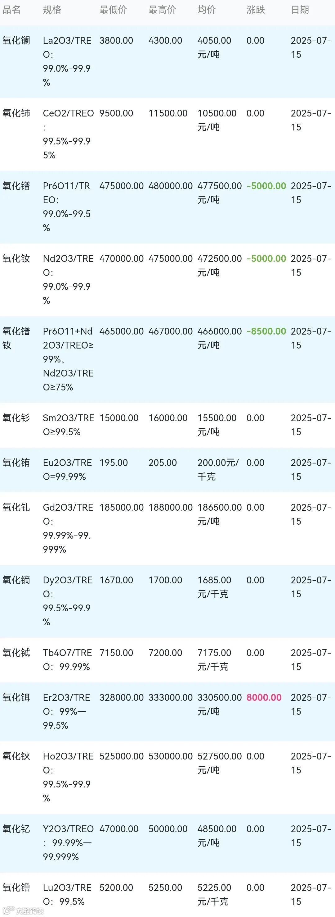 2025年07月15日稀土氧化物材料市场参考价: