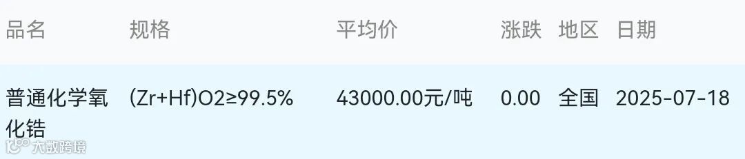 2025年07月18日氧化锆材料市场参考价: