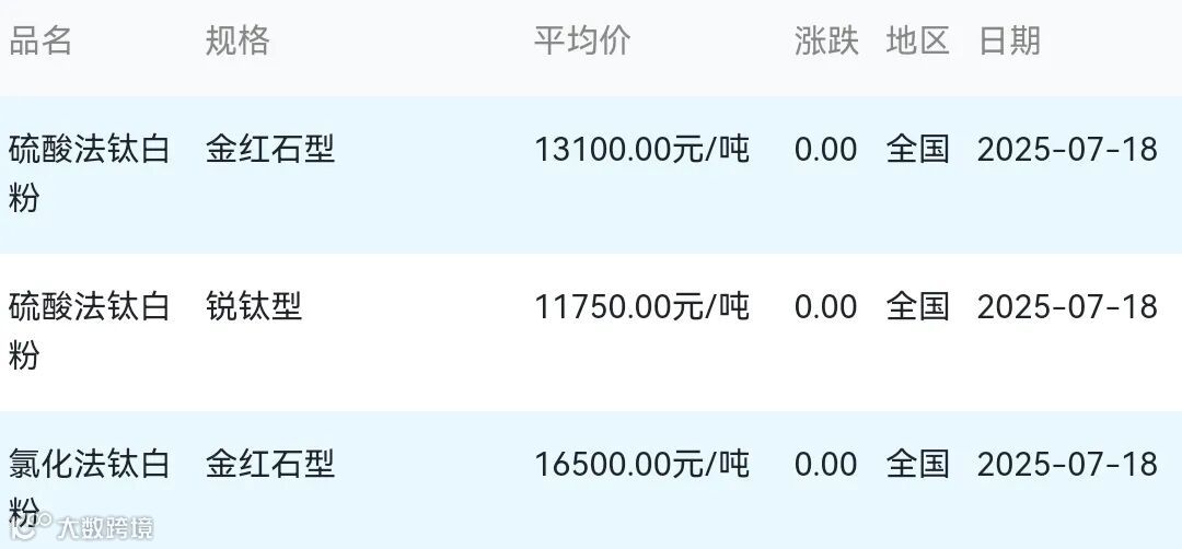 2025年07月18日钛白粉材料市场参考价: