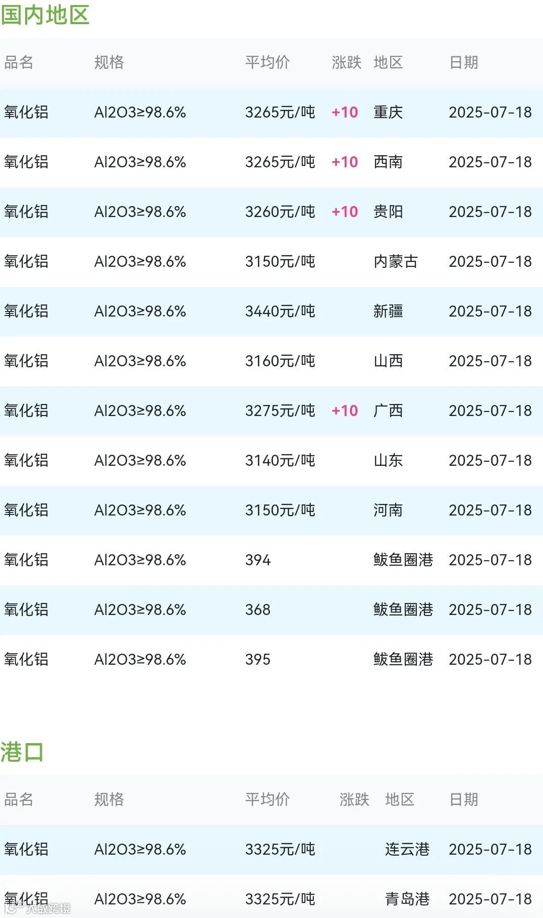 2025年07月18日氧化铝粉体材料市场参考价: