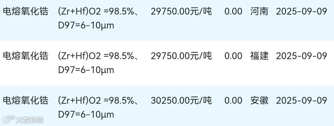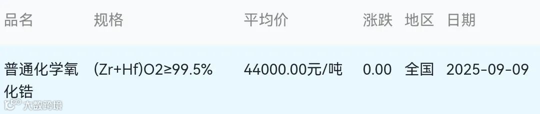 2025年09月09日氧化锆材料市场参考价: