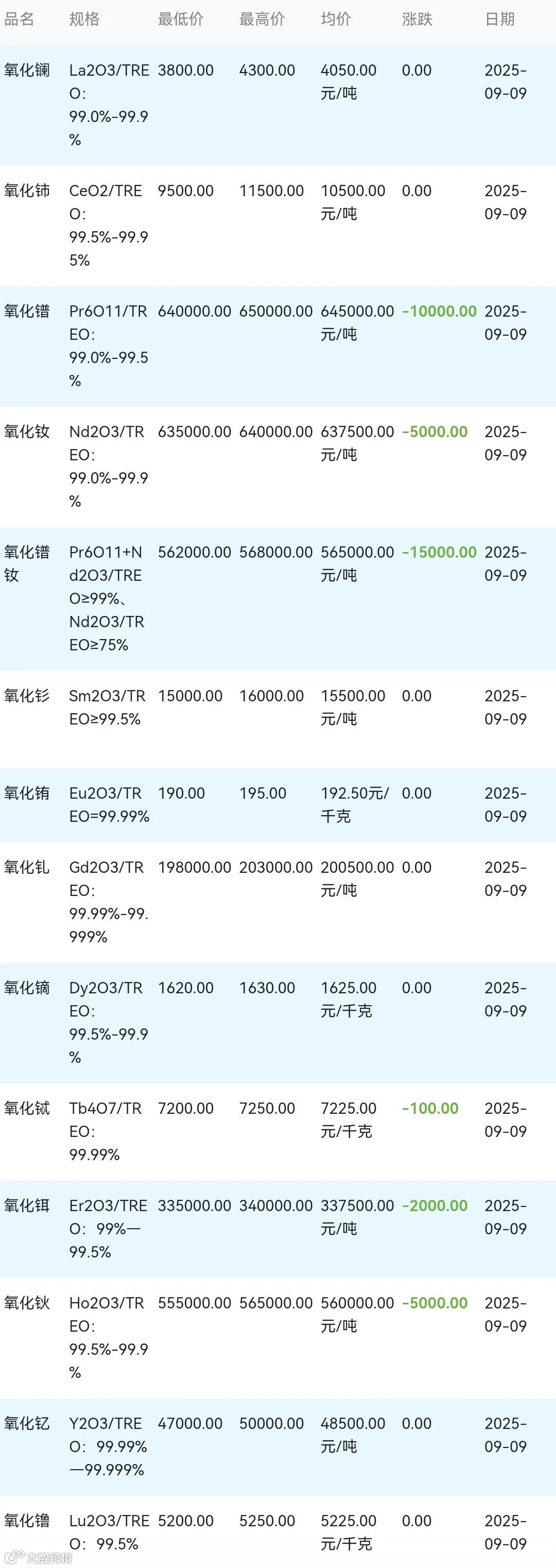 2025年09月09日稀土氧化物材料市场参考价: