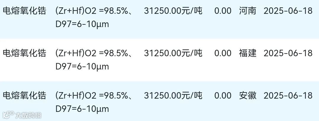 2025年06月18日氧化锆材料市场参考价: