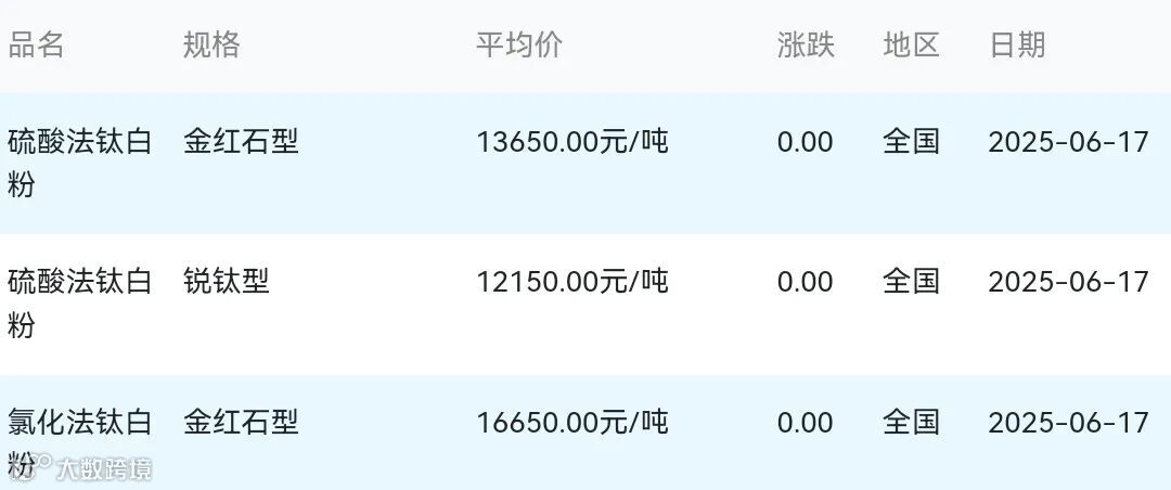2025年06月17日钛白粉材料市场参考价: