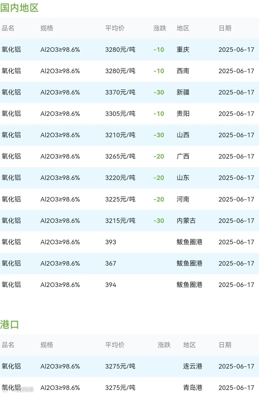 2025年06月17日氧化铝粉体材料市场参考价: