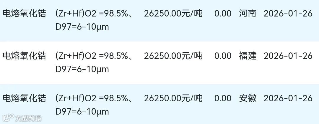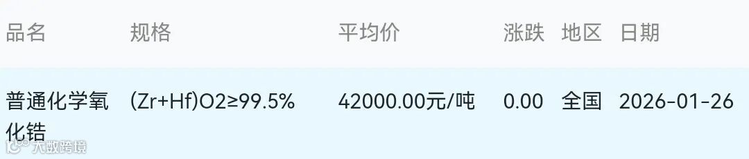2026年01月26日氧化锆材料市场参考价: